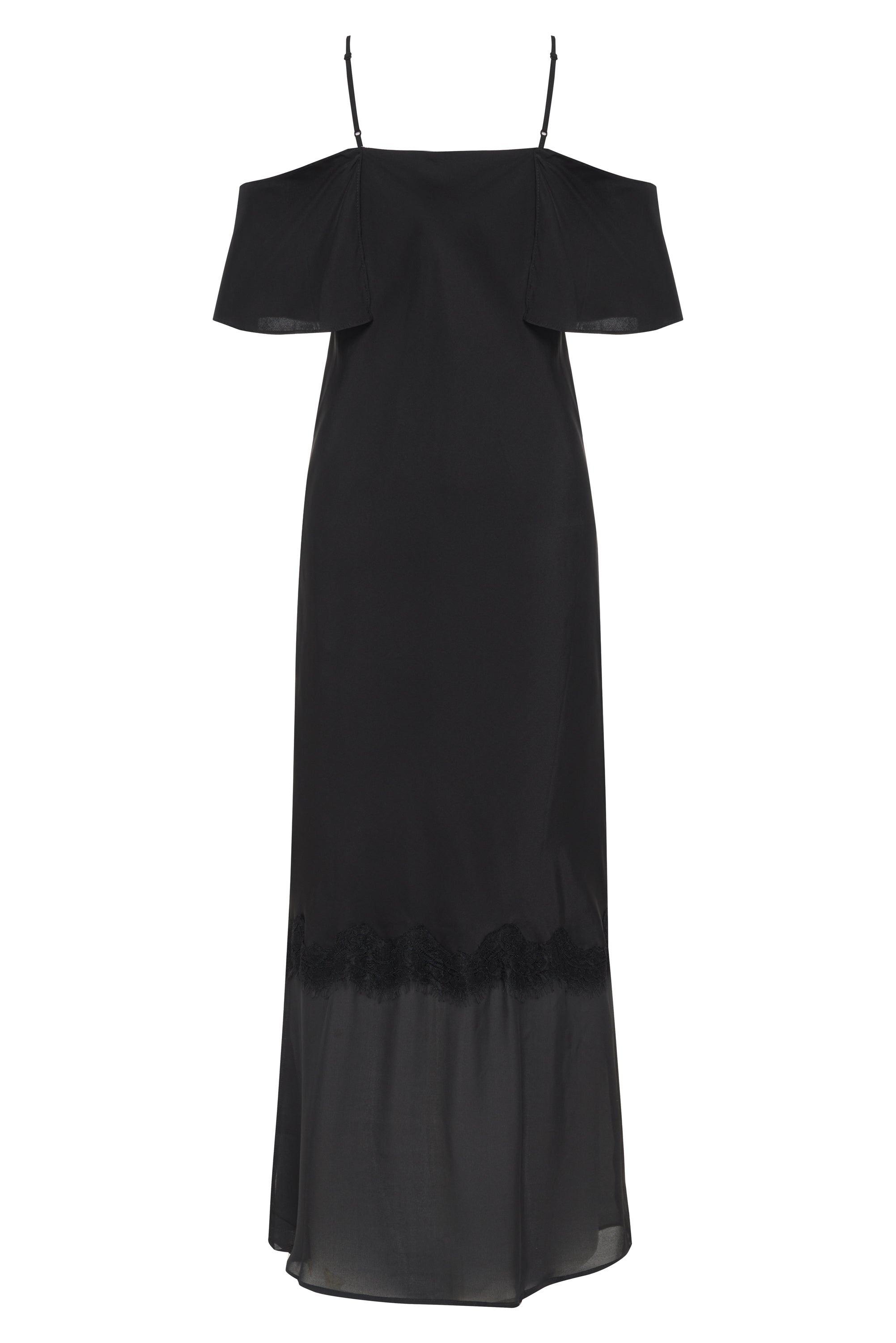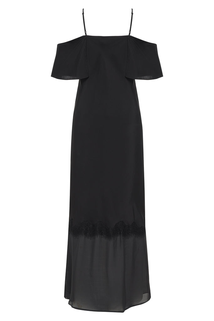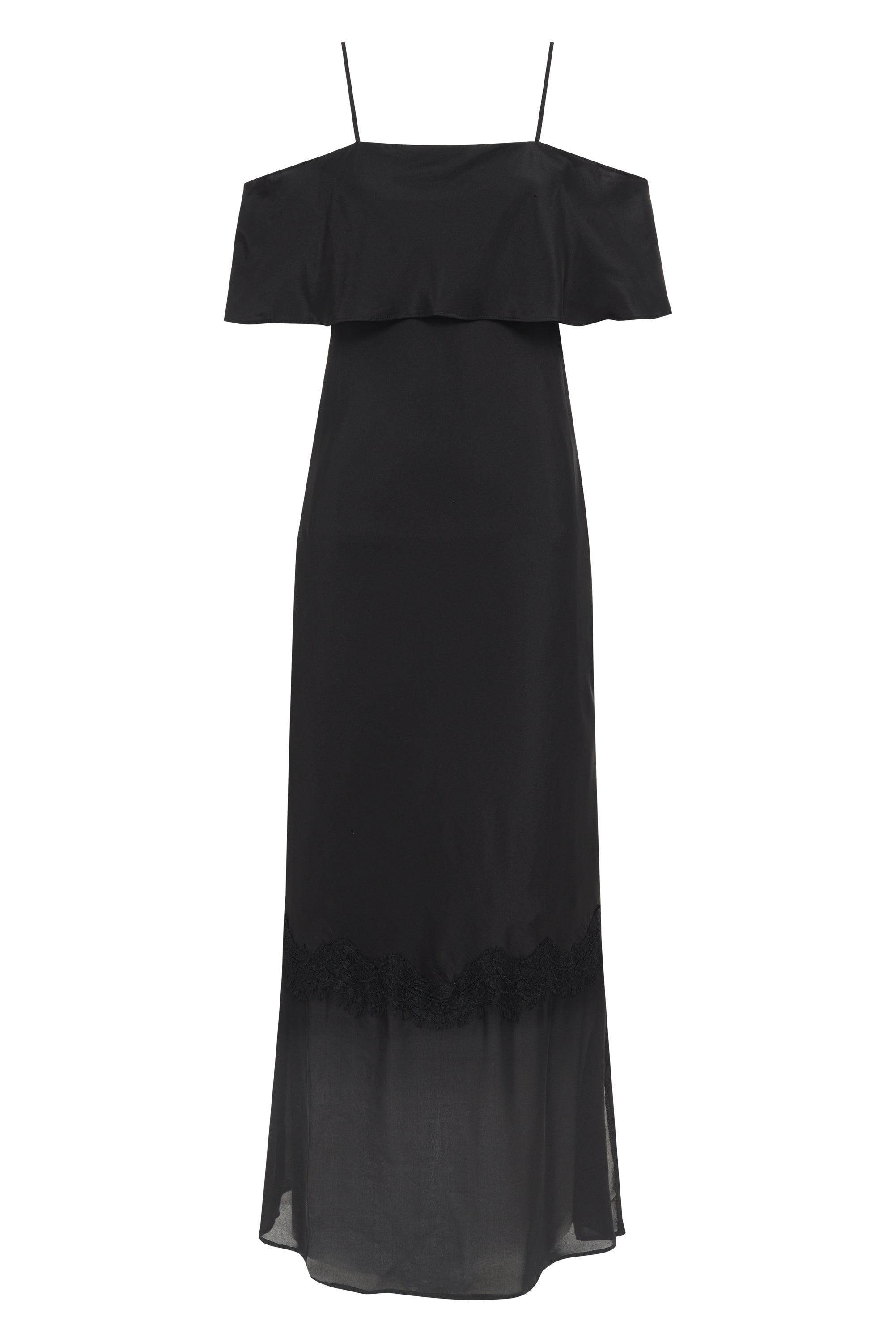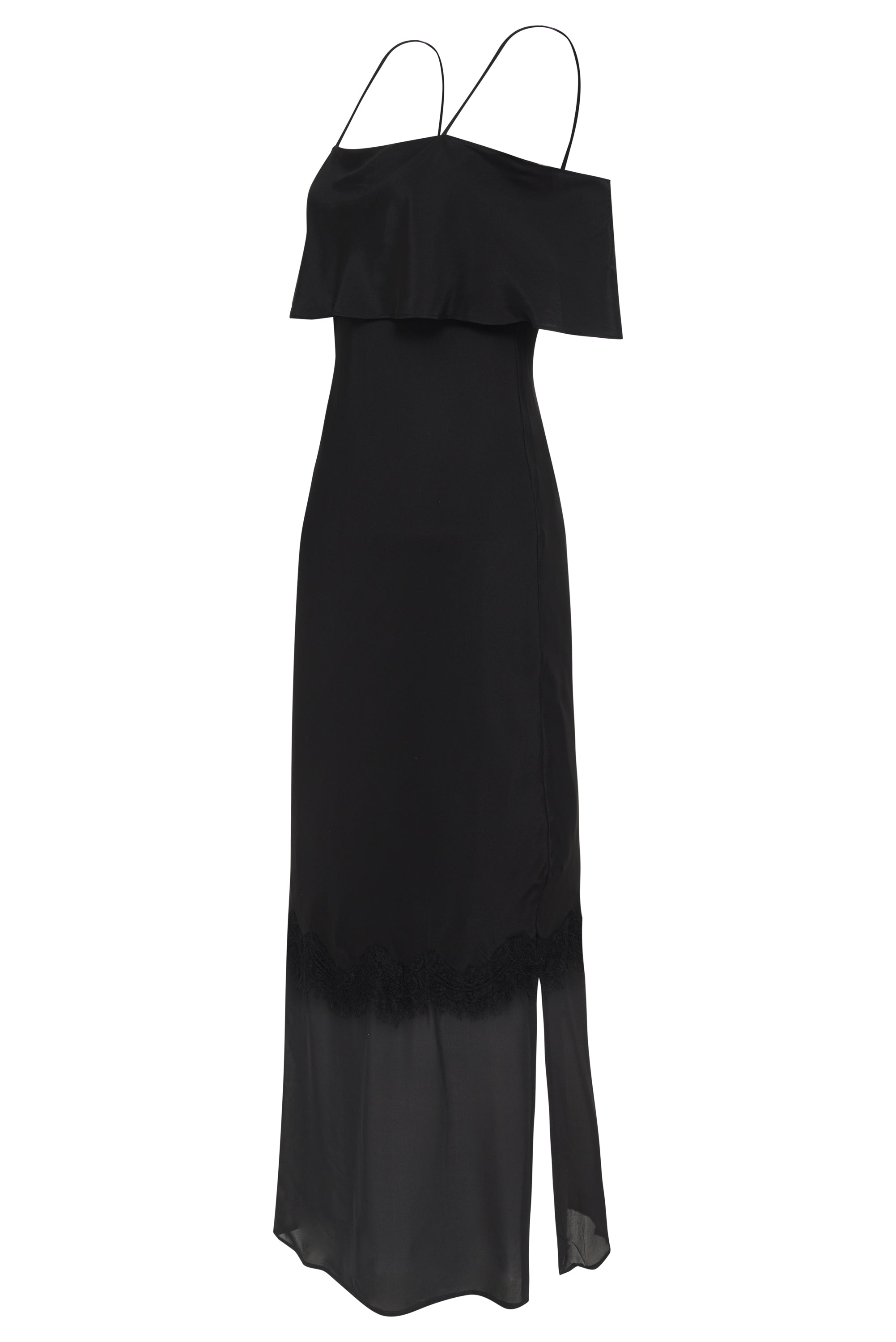 The pre- washed silk Kaia Sheer Bottom Long Dress is designed to be lightweight and comfortable, while still accentuating the body. A playful sheer bottom with delicate lace embellishments adds a touch of elegance. The flattering off shoulder detail is simply stunning. This maxi / full length dress is cut on bias, and finished with adjustable straps and a leg slit.