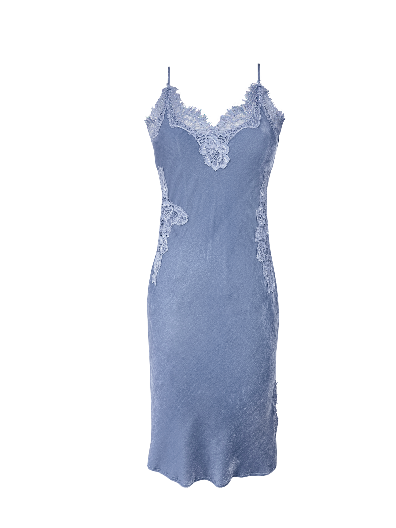 Velvet mid length slip dress with adjustable straps and finished with lace on the neckline and has a leg slit on the left side.