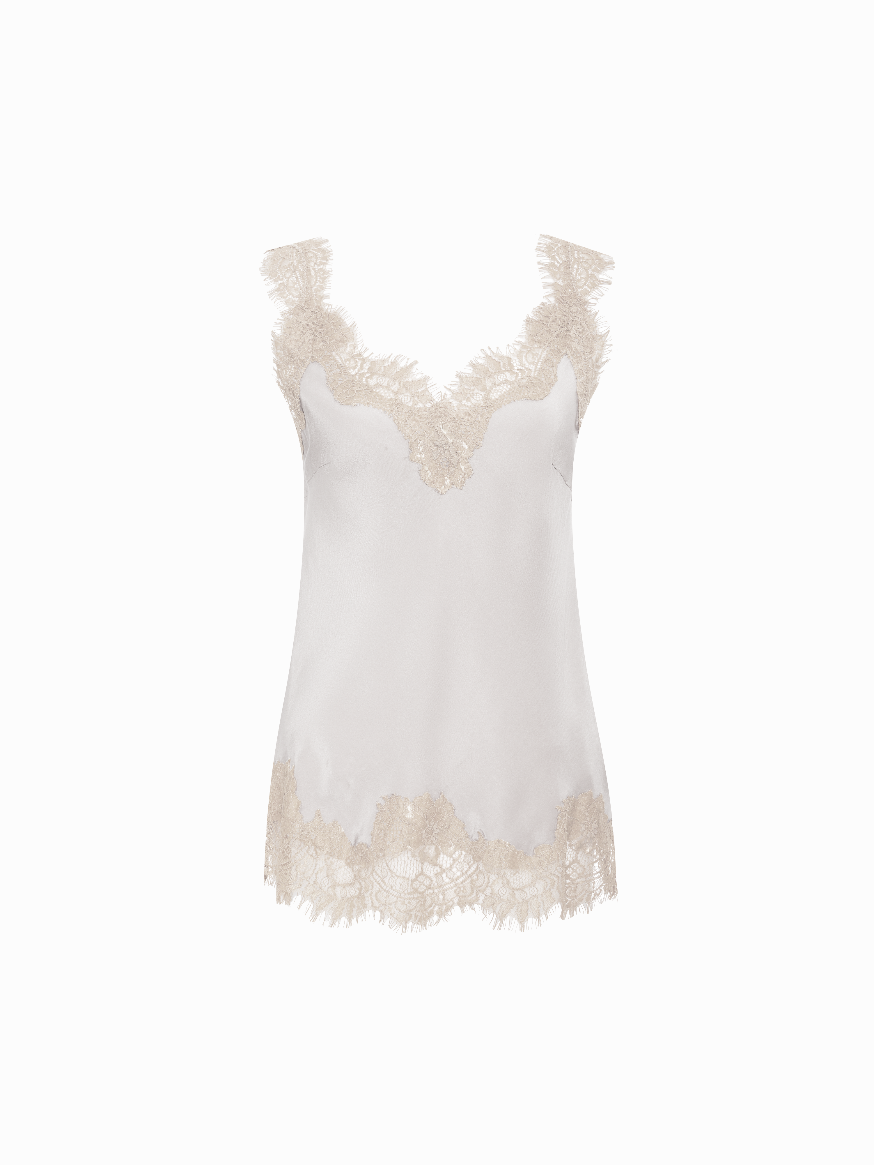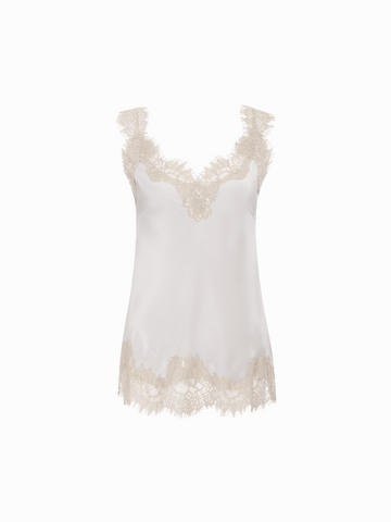 Bra-friendly and unlined silk cami, cut on bias, and finished with our signature Coco Lace on the hem, neckline and straps. This camisole has a V-neck style and is our favorite one to layer with off shoulder blouses and dresses.