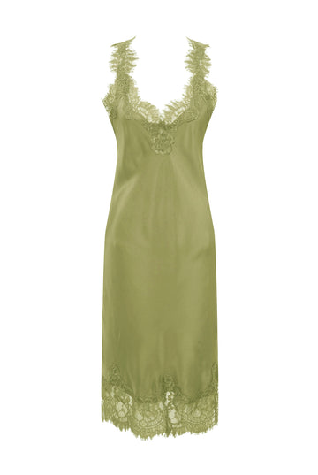 Silk midi / knee length dress cut on the bias and finished with our signature Coco lace on the hem, necklines, and straps. Bra-friendly. One of our favorites to layer with!