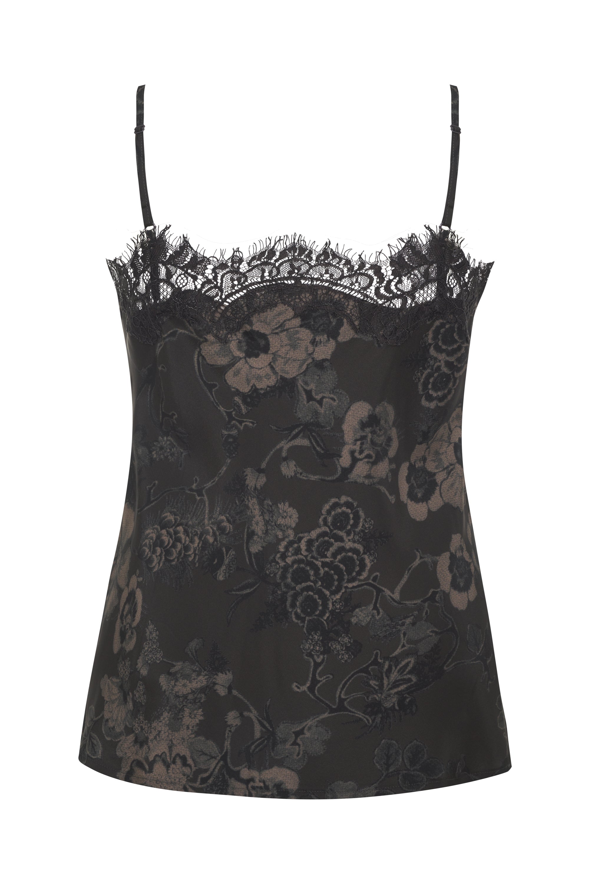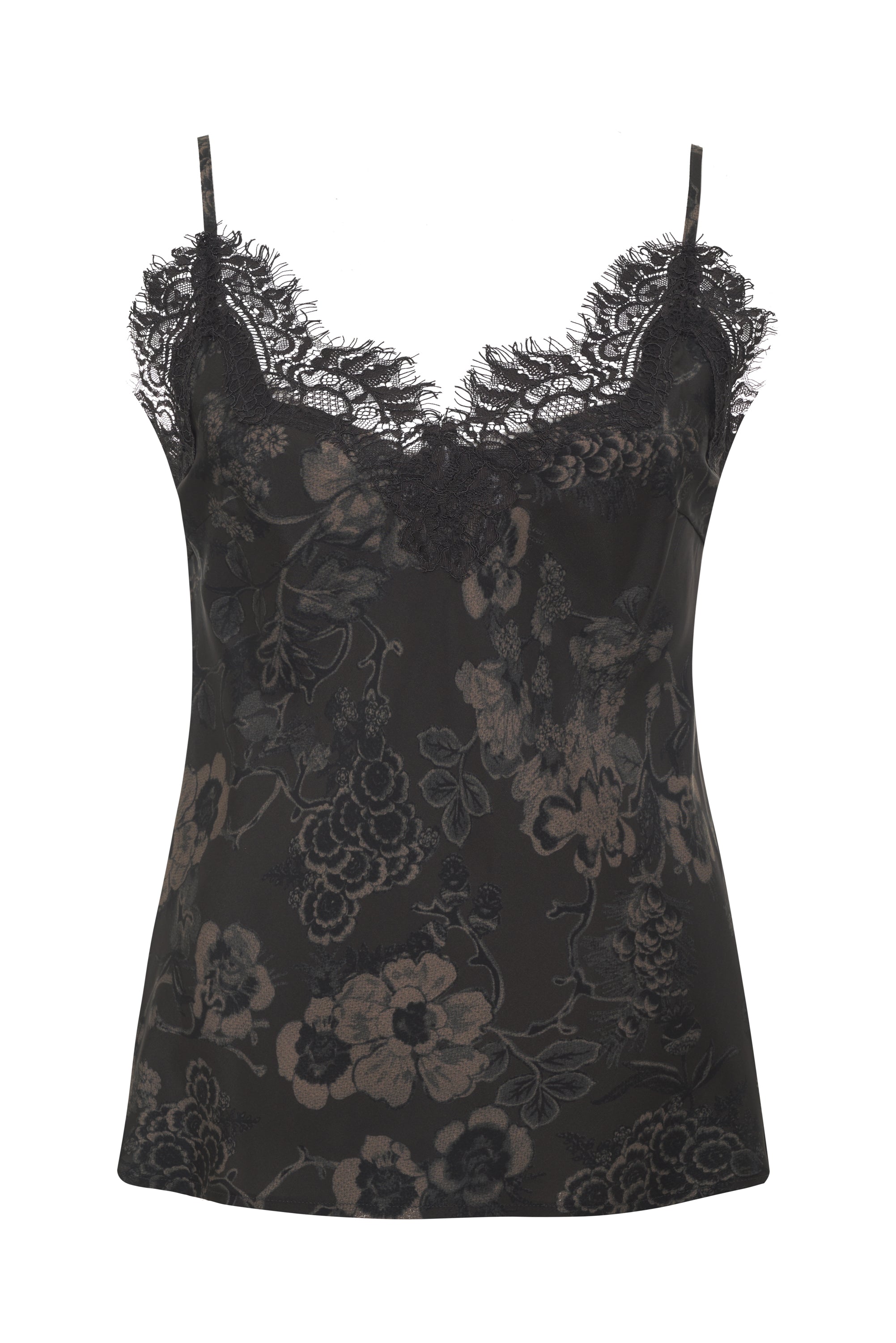 Silk cami cut on bias with a V neck line. This camisole has adjustable straps, two small slits on the side seams, and is finished with our signature Coco lace on the neckline.