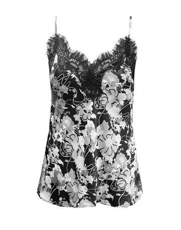 Silk cami cut on bias with a V neck line. This camisole has adjustable straps, two small slits on the side seams, and is finished with our signature Coco lace on the neckline.
