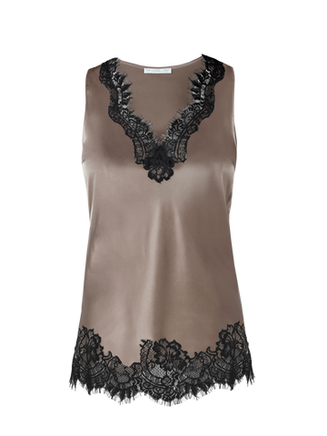 Bias-cut silk V-neck tank with lace detailing on neckline and hem. Bra-friendly design.