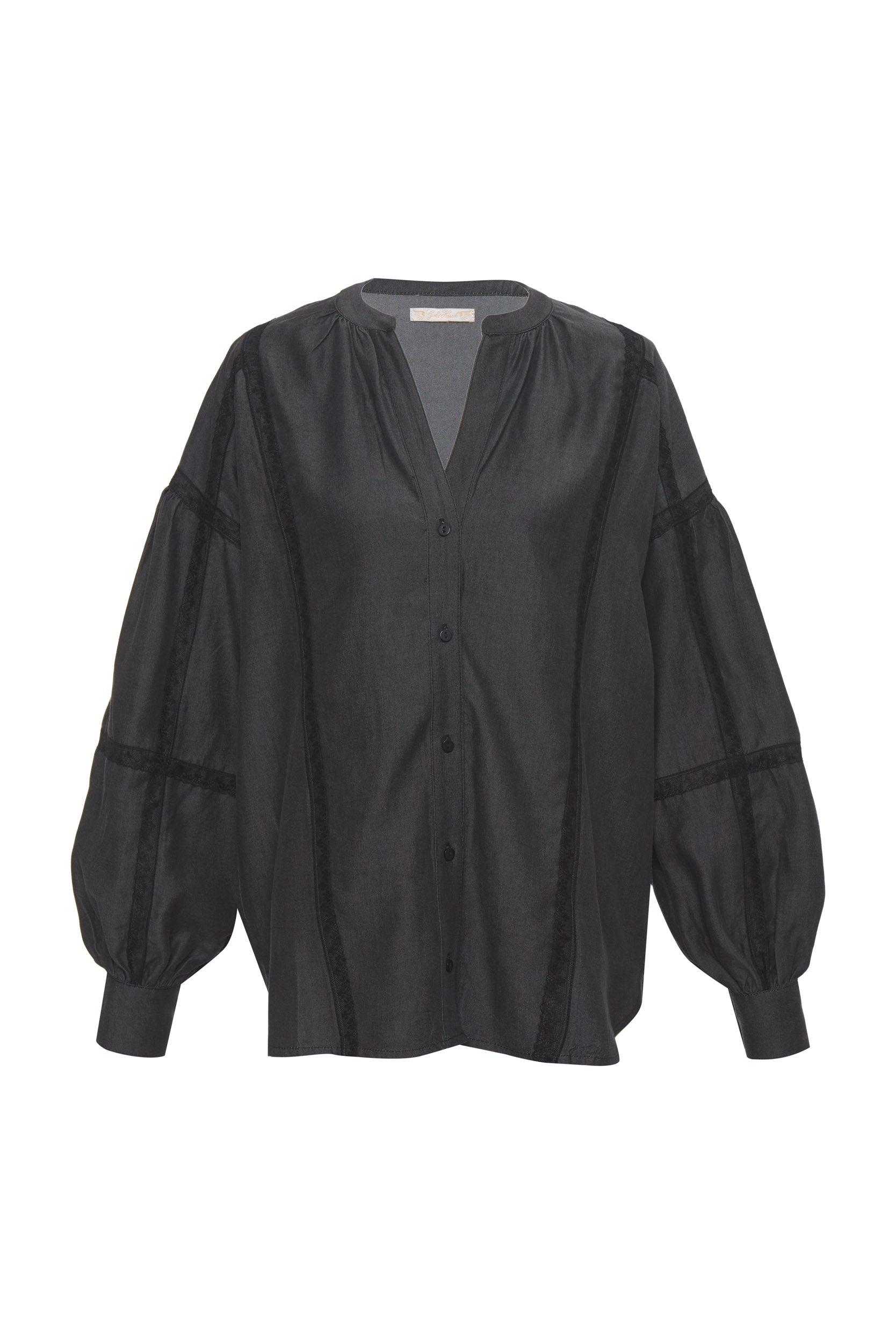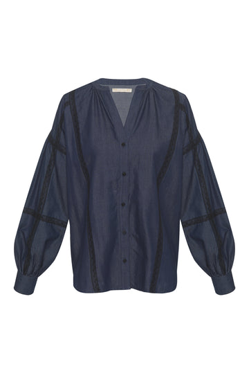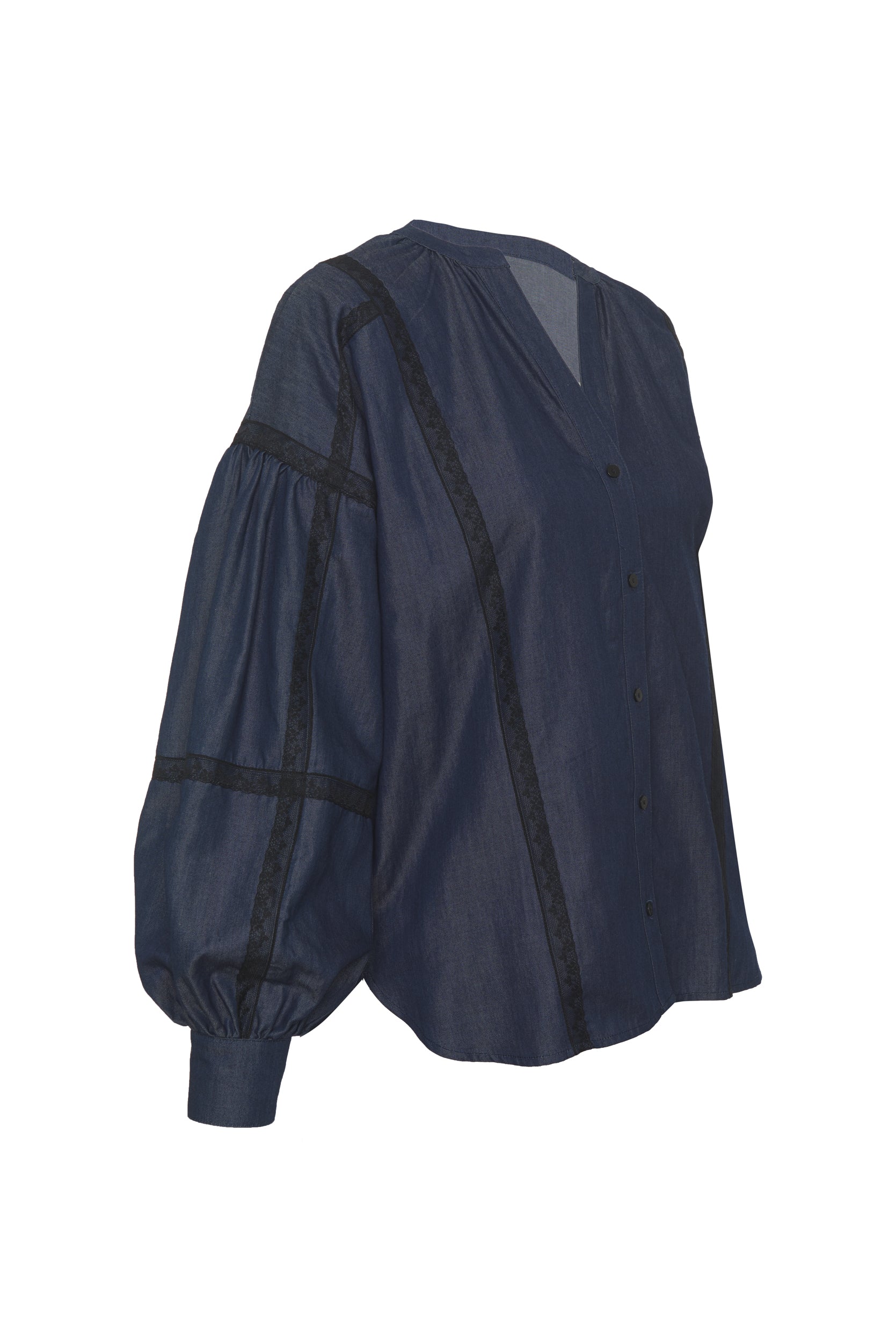 Multi panel denim and Tencel long sleeve top. The panel seams are finished with black lace, the cuffs, sleeves, and neckline are gathered, and the neck is an open V-neck style with functioning buttons down center front and on cuffs. This blouse has a longer back panel than the front.