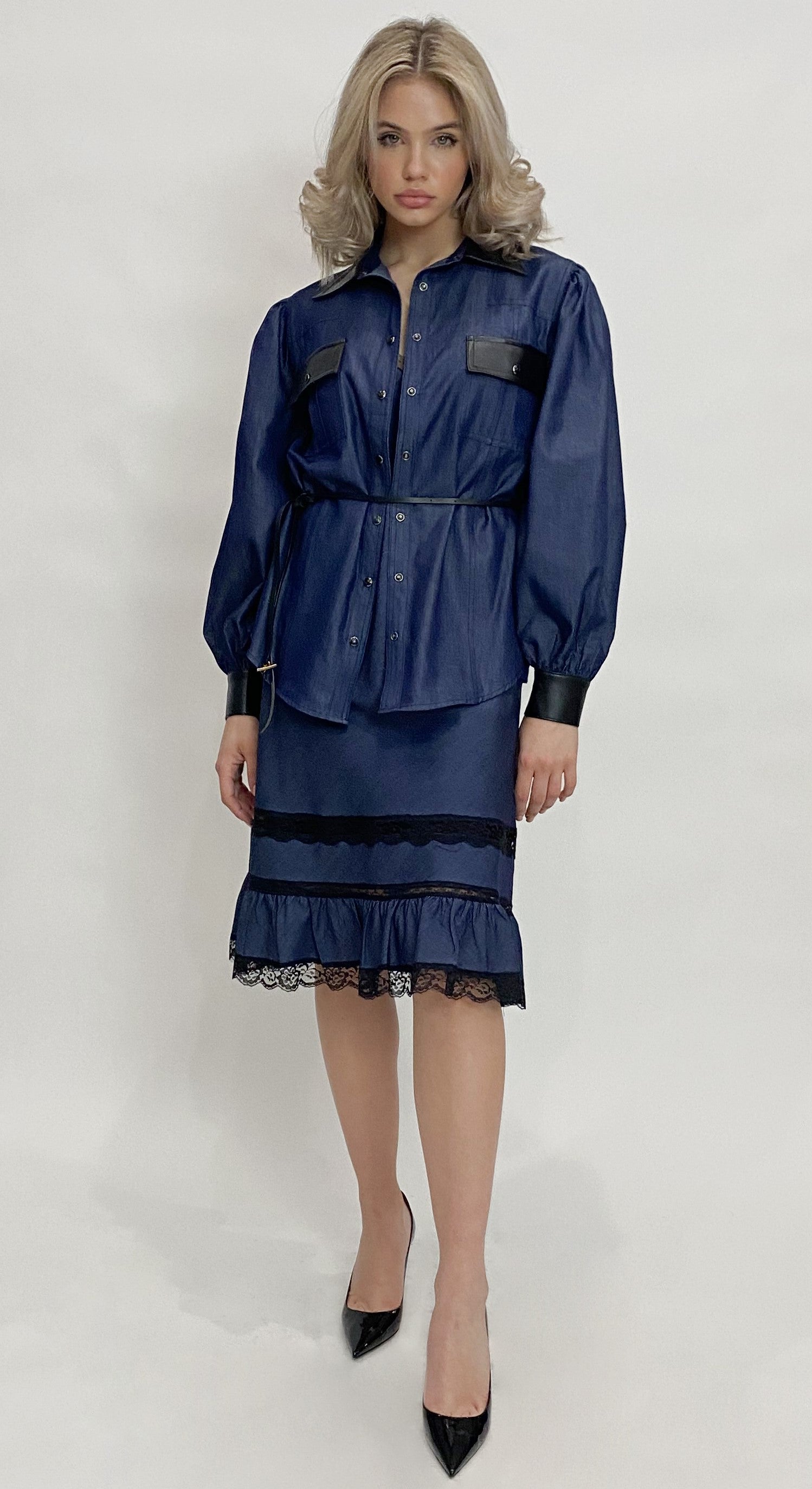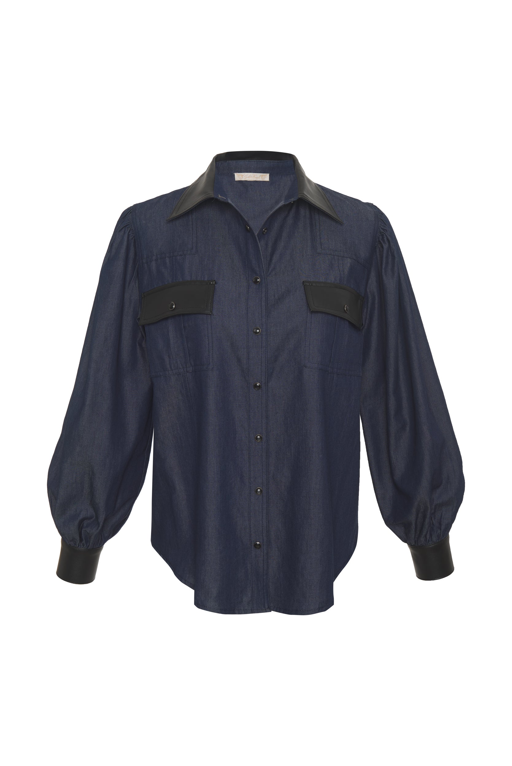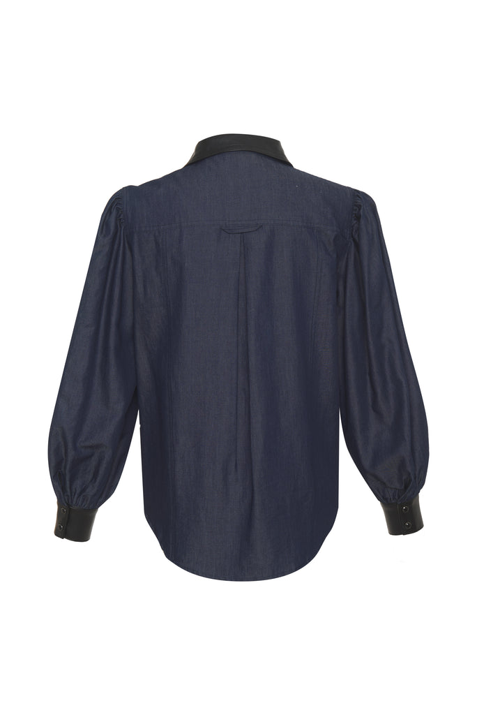 Tencel denim top with faux leather trim in the collar, front chest pocket flaps, and cuffs. This blouse has gathered shoulders and cuffs, and black snap buttons throughout