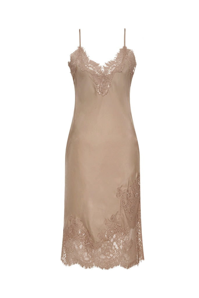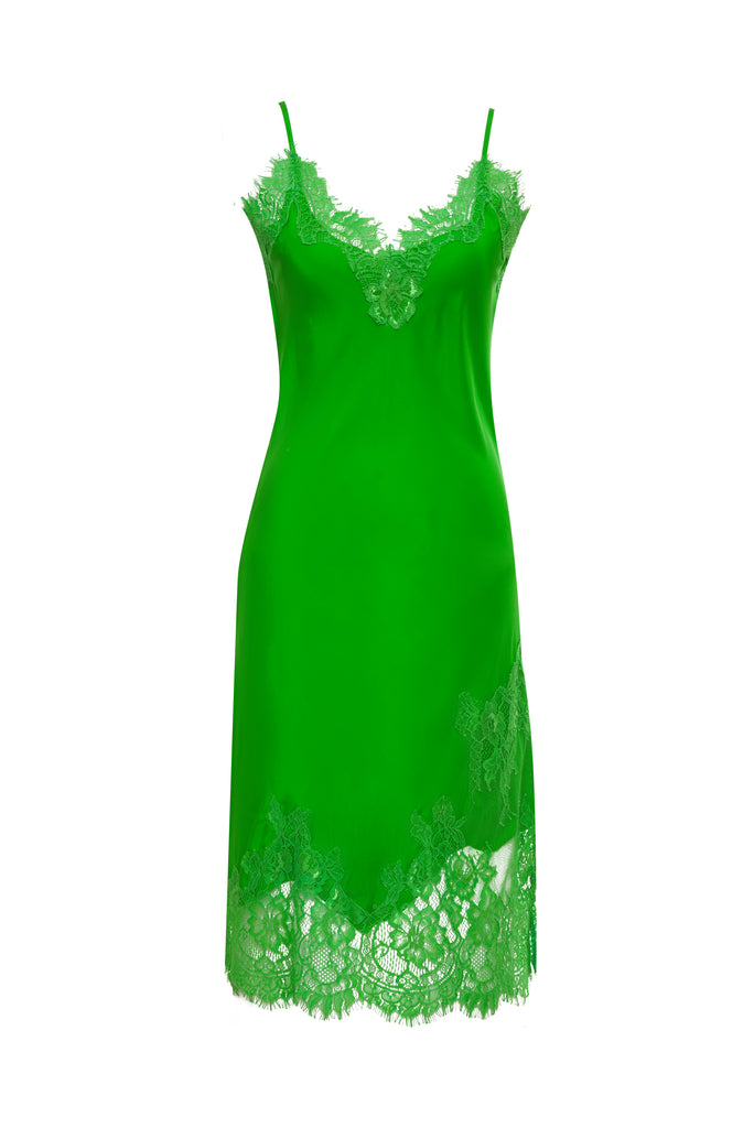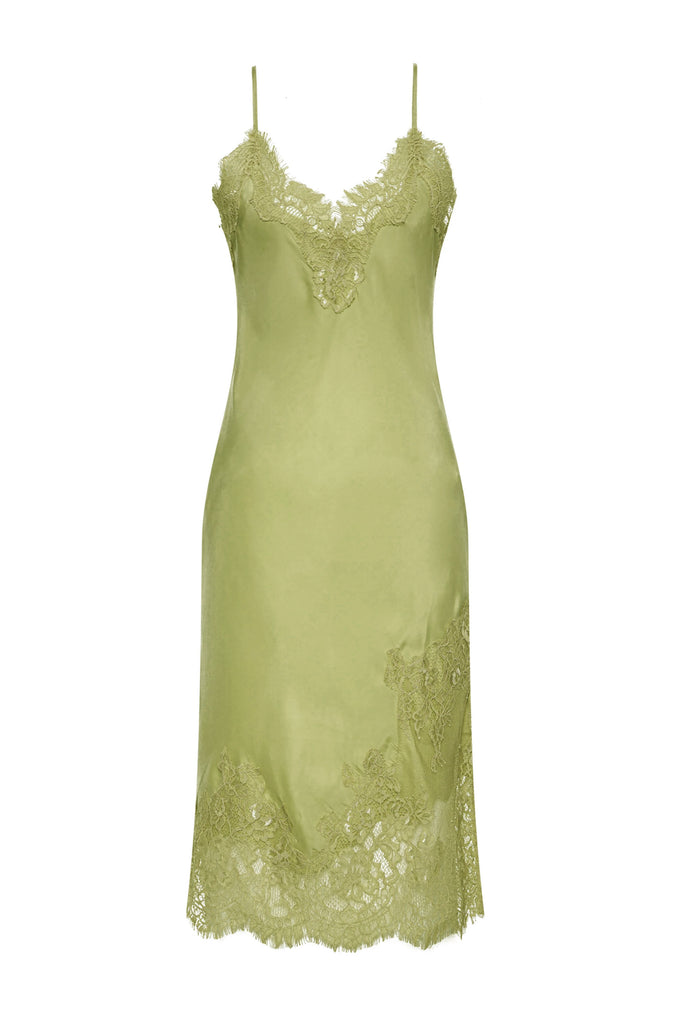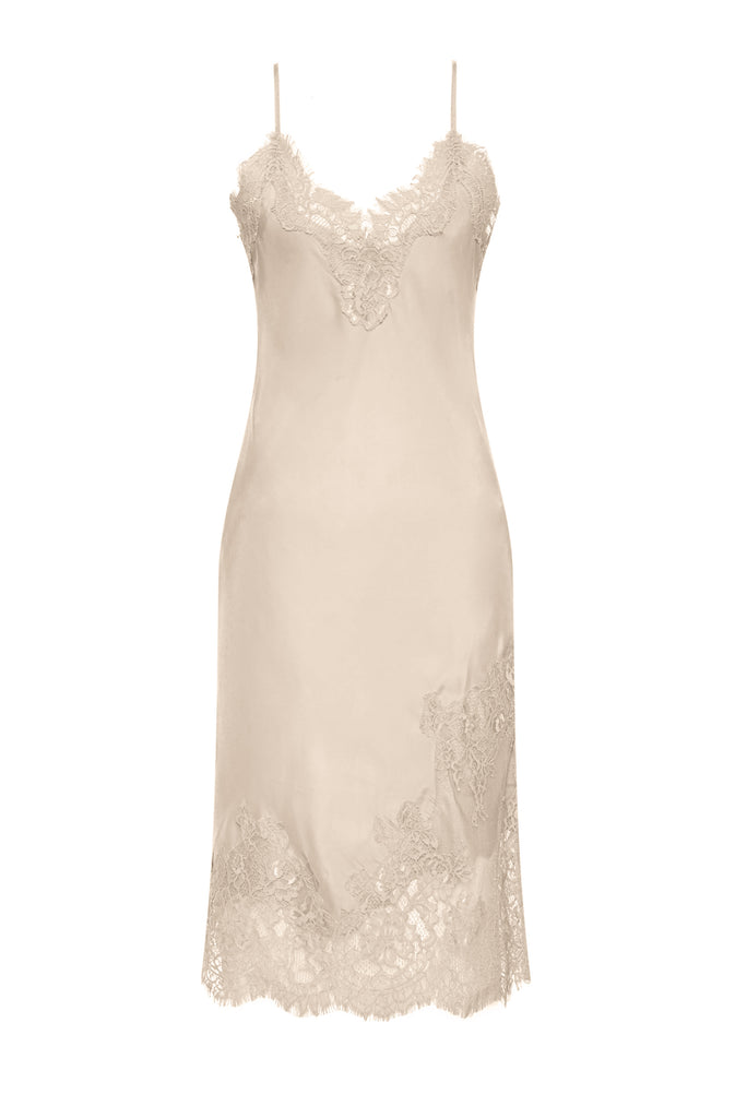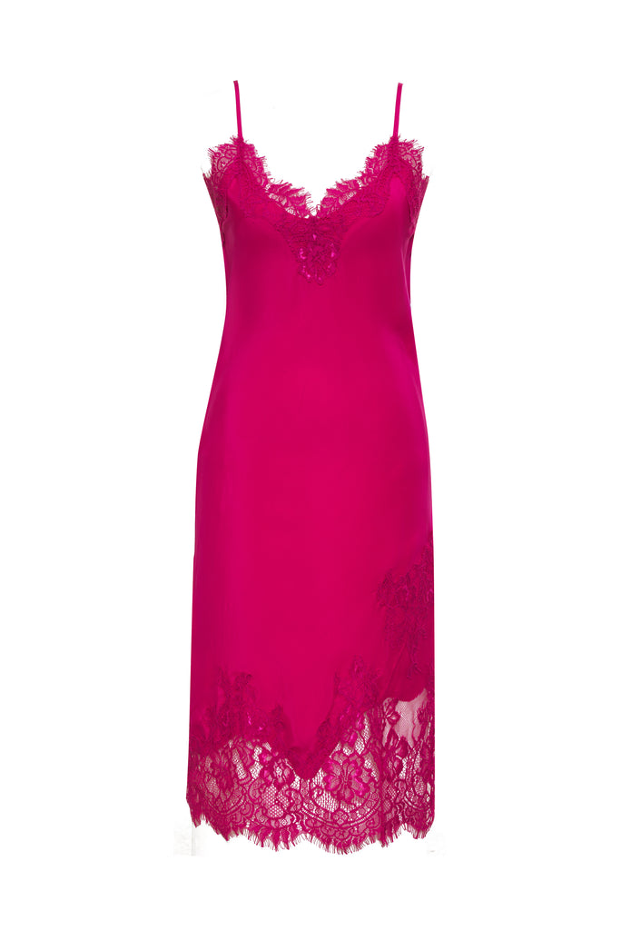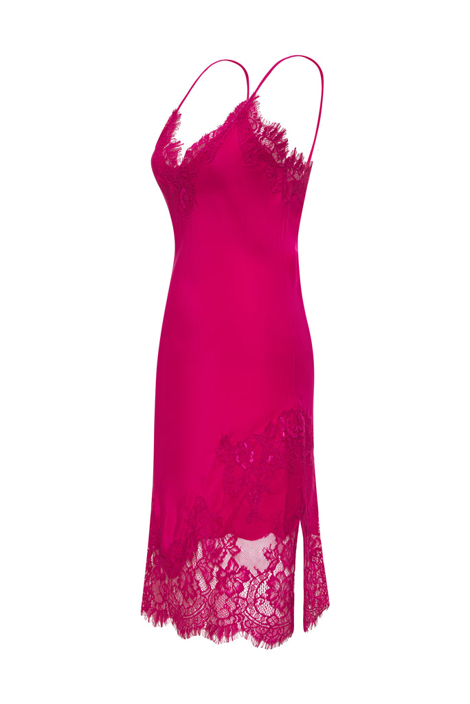 Silk midlength slip dress with adjustable straps and finished with lace on the neckline and hem. This dress has a leg slit on the left side.