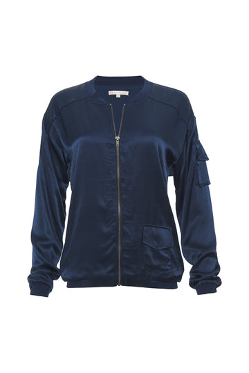 Viscose bomber jacket with center front zipper and pockets. Perfect for layering. This jacket is lined.