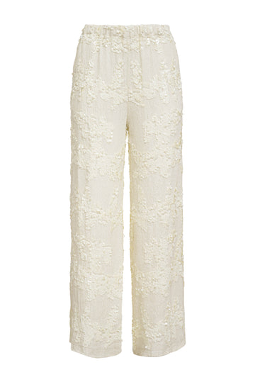 Luxe hand embellished sequins of multiple sizes adorn this pull up wide leg pant. This bottom is lined, has two side seam pockets, two back pockets, and elastic in the waistband.
