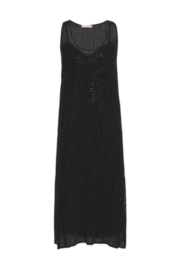 A midi / calf length dress made out of luxurious georgette fabric with hand embellished sequins. This dress comes with a slip as a lining, a braided, thin belt with pom poms at the end., and has two leg slits on the side seams. Our favorite way to style this tank dress is with a Coco lace camisole peeking from the neckline and the Liza Sequin Jogger in the same color underneath.