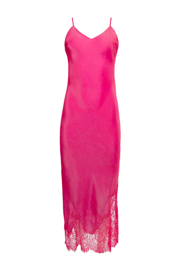 Silk maxi / full length dress cut on bias and with leg slits on the side seams. This dress is and finished with our signature Coco Lace at the hem.