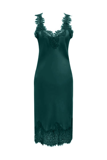 Silk midi / knee length dress cut on the bias and finished with our signature Coco lace on the hem, necklines, and straps. Bra-friendly. One of our favorites to layer with!