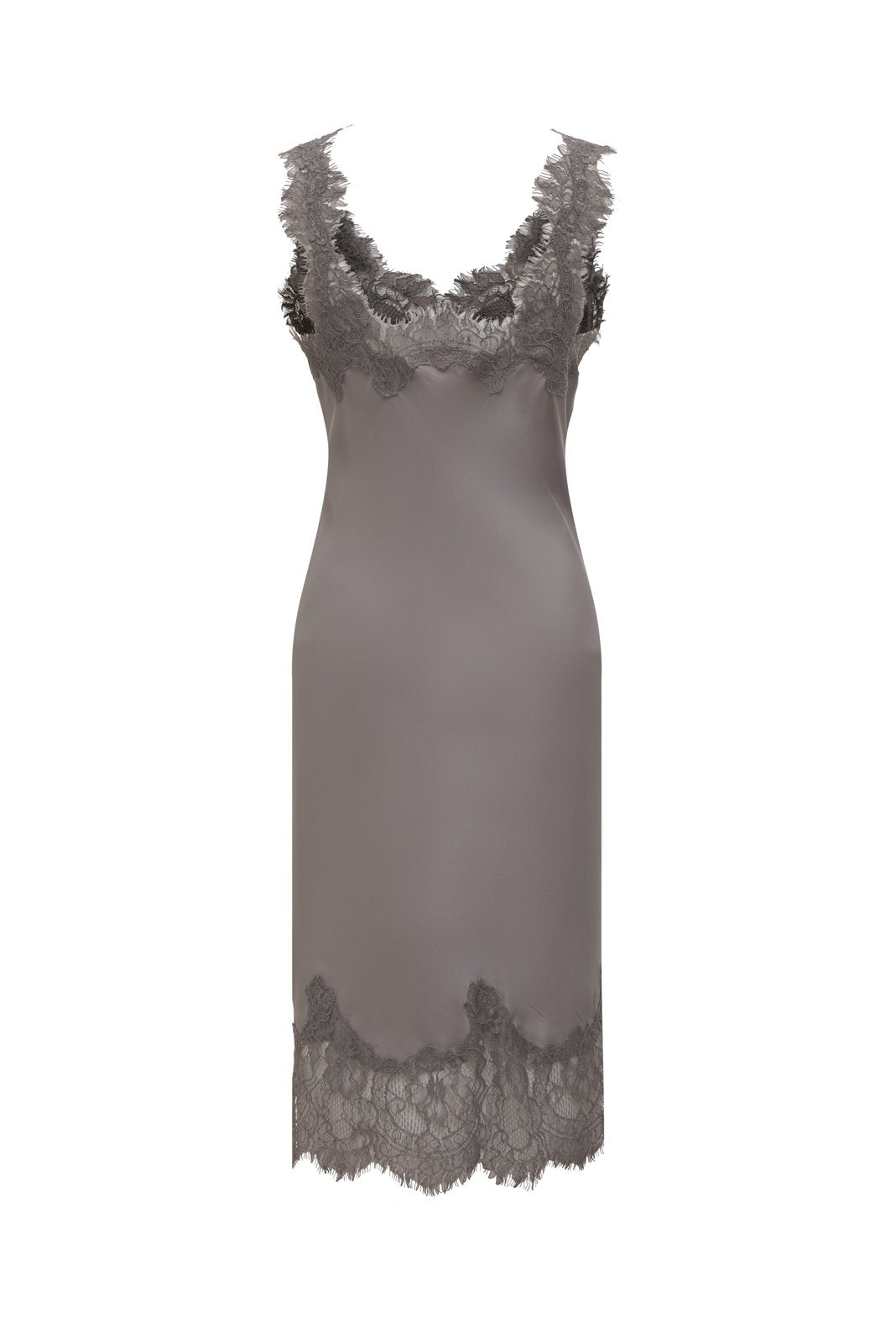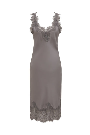 Silk midi / knee length dress cut on the bias and finished with our signature Coco lace on the hem, necklines, and straps. Bra-friendly. One of our favorites to layer with!