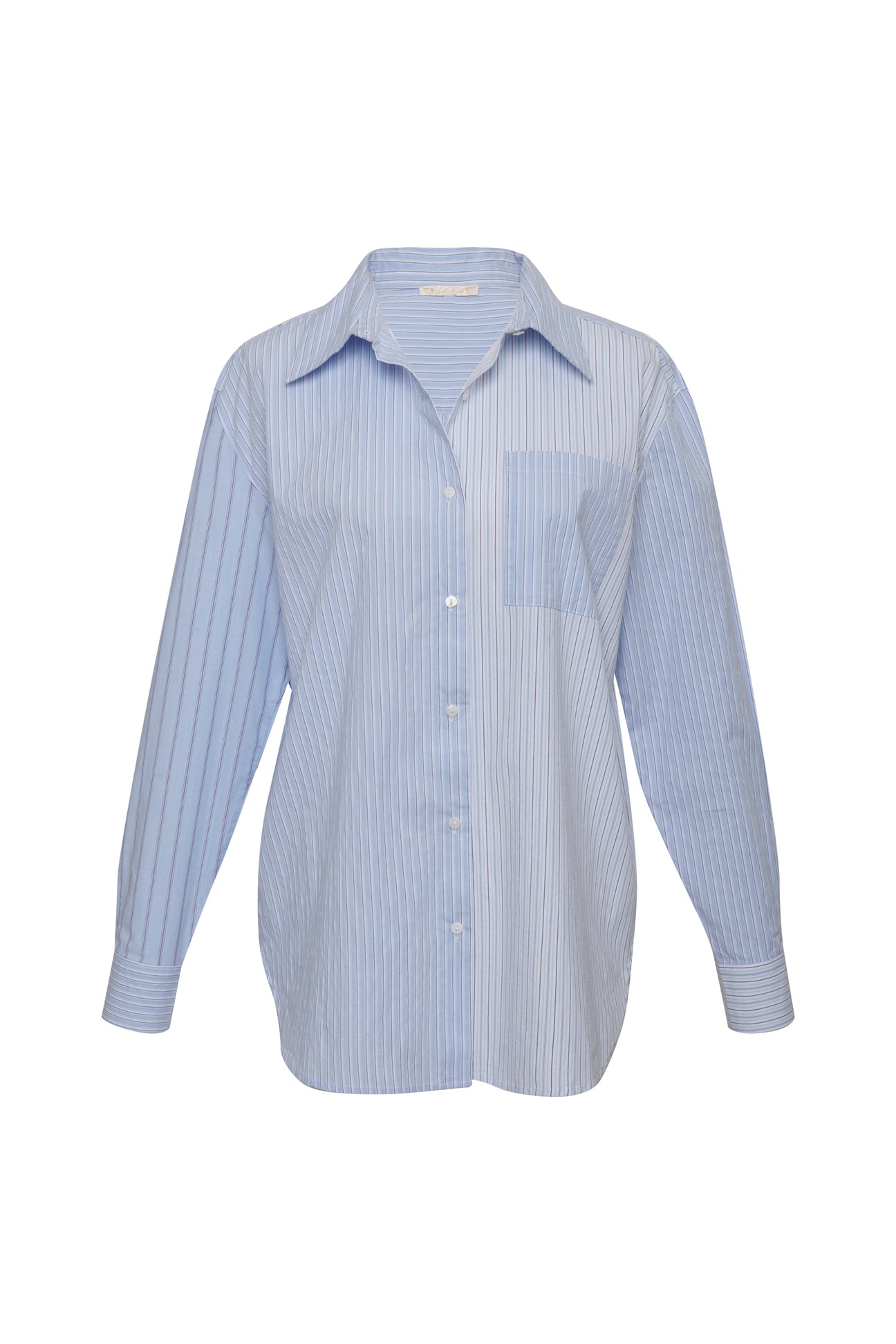 Button up, long sleeve, collared top made out of crisp Poplin. This blouse has one chest pocket and is made up of three different stripe combinations.