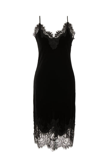 Silk blend velvet midi / knee length dress with a v neck line and adjustable straps. This dress is cut on bias and finished with hand cut lace at the neck lines and hem.
