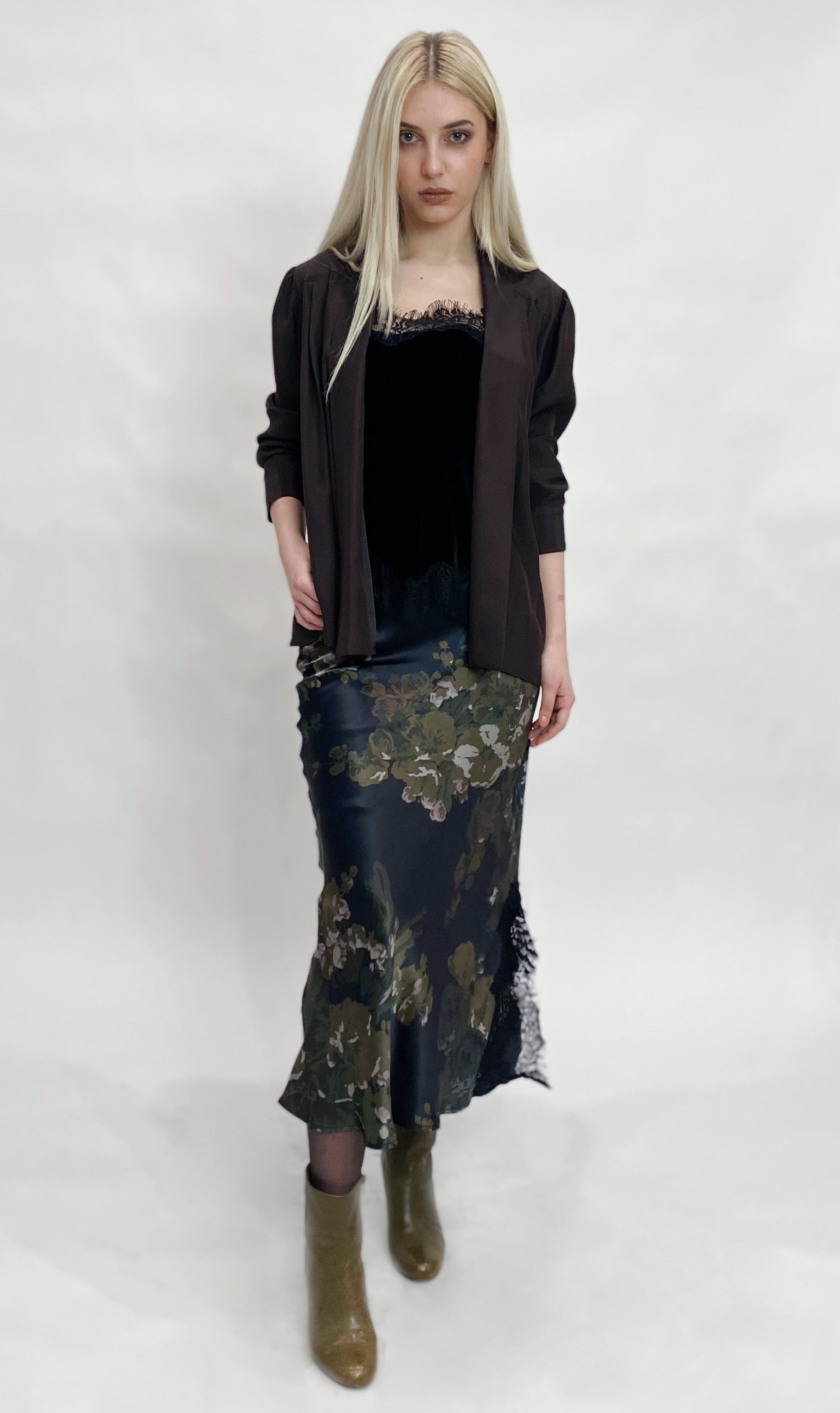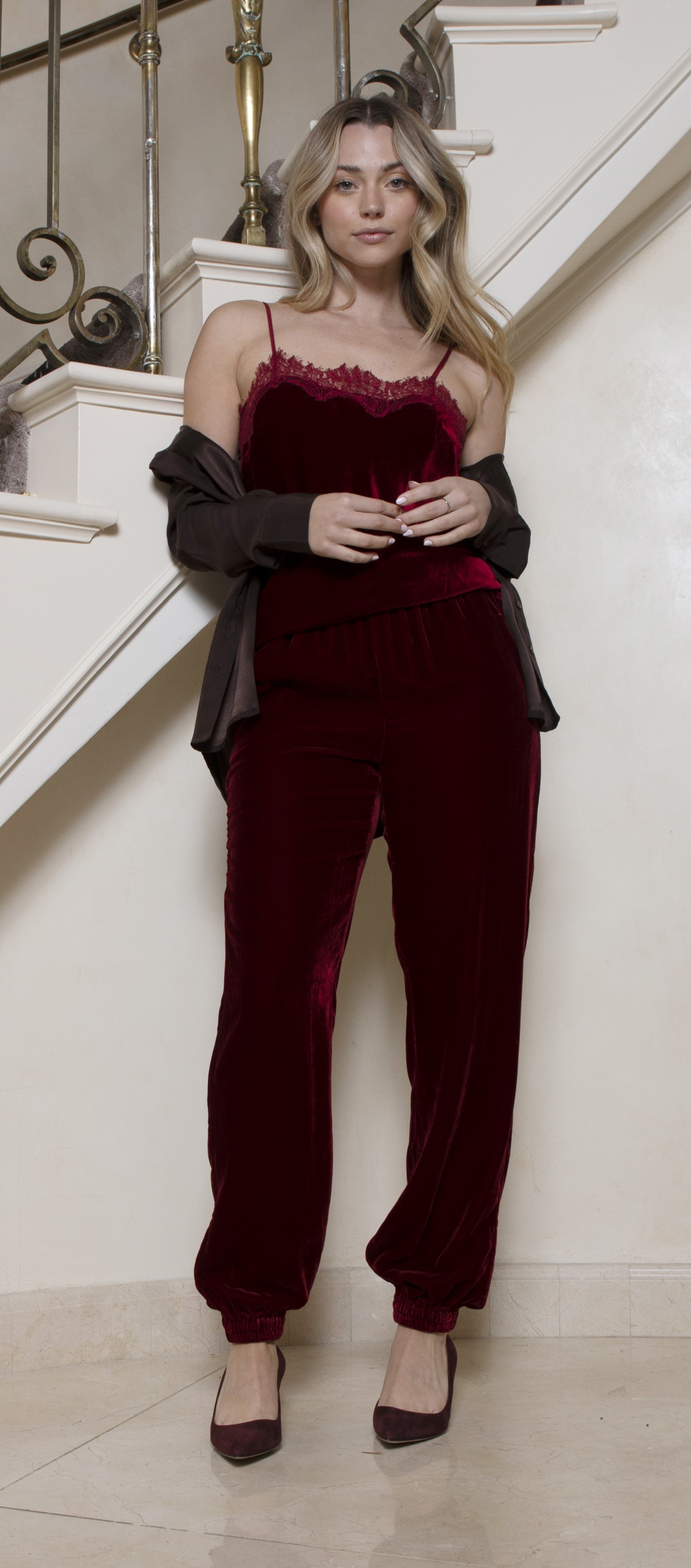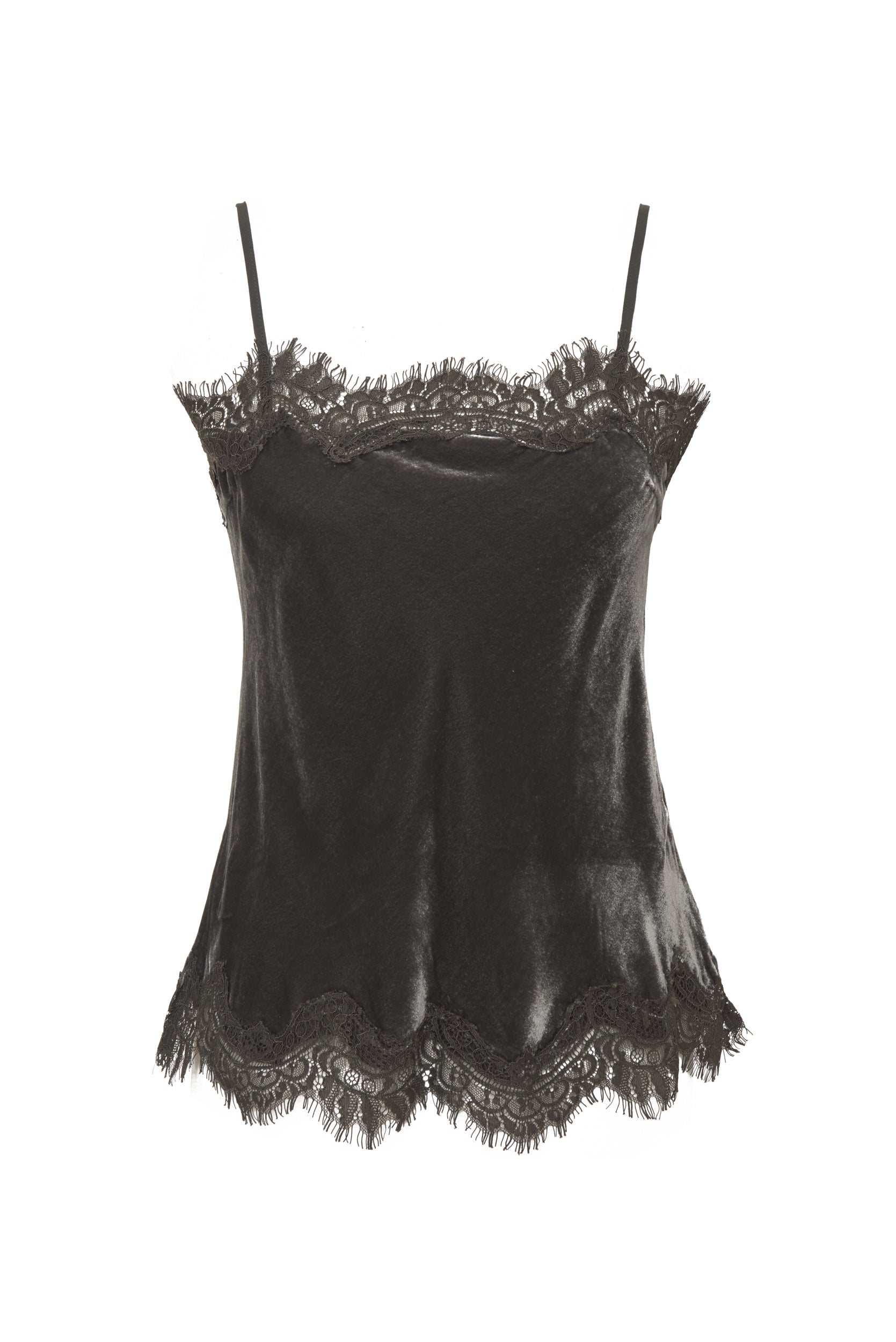 Silk blended velvet cropped camisole with a straight across neckline. This cami is cut on bias, has adjustable straps, and is finished with lace at the neckline and hem.