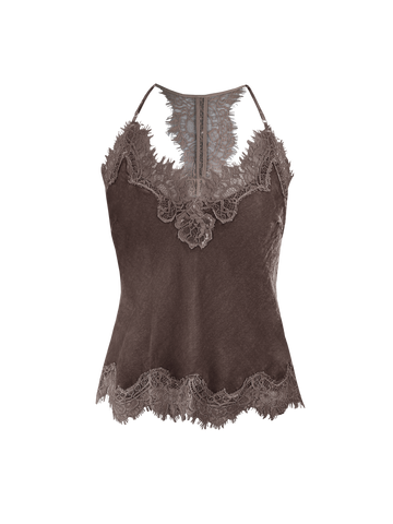 Silk blend velvet cropped camisole with a racerback lace detail. The cami is cut on bias, has adjustable straps, and is finished with lace at the necklines and hem.