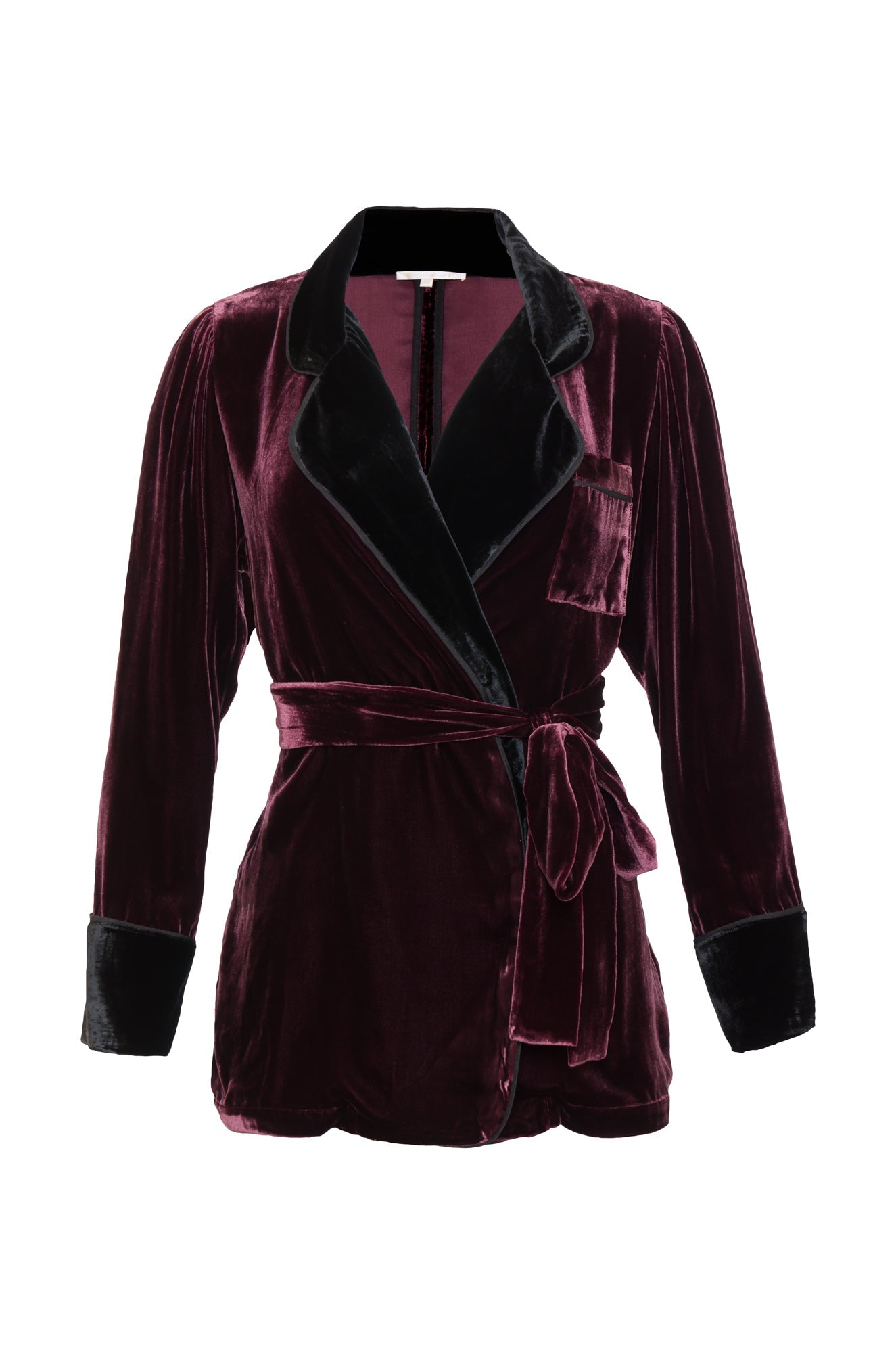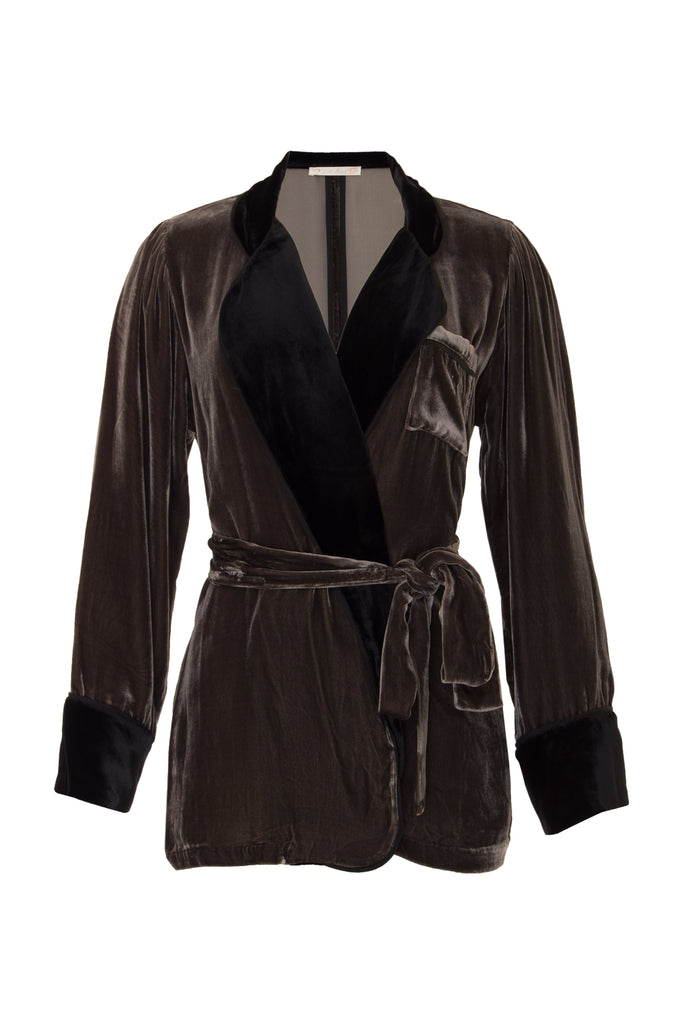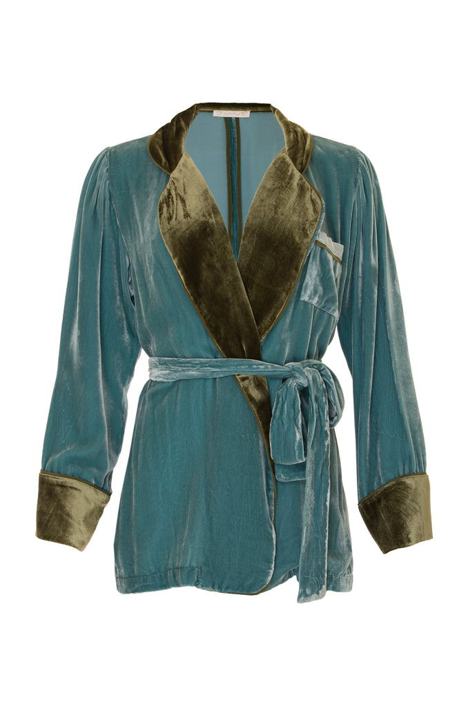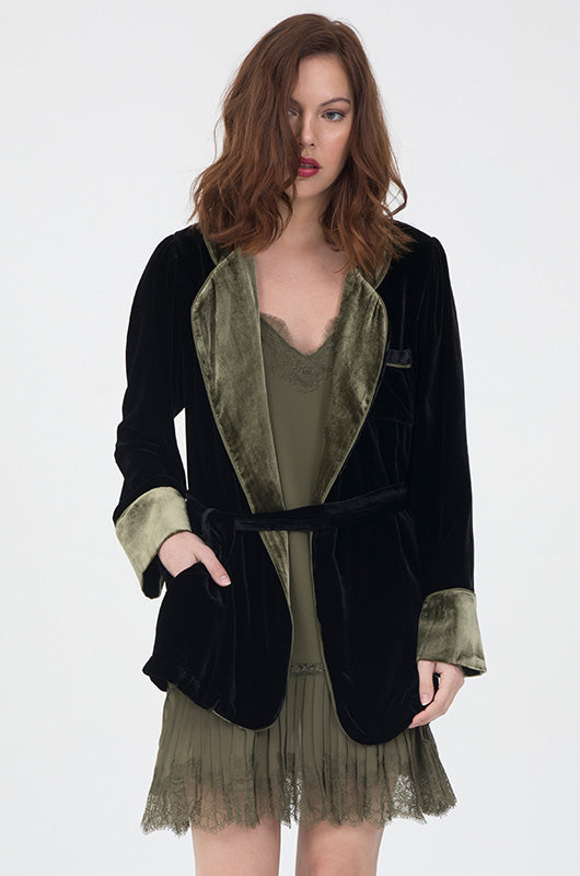 Silk blended luxurious velvet smoking style jacket. This robe has two pockets, contrast cuffs and lapels, and comes with a matching belt.